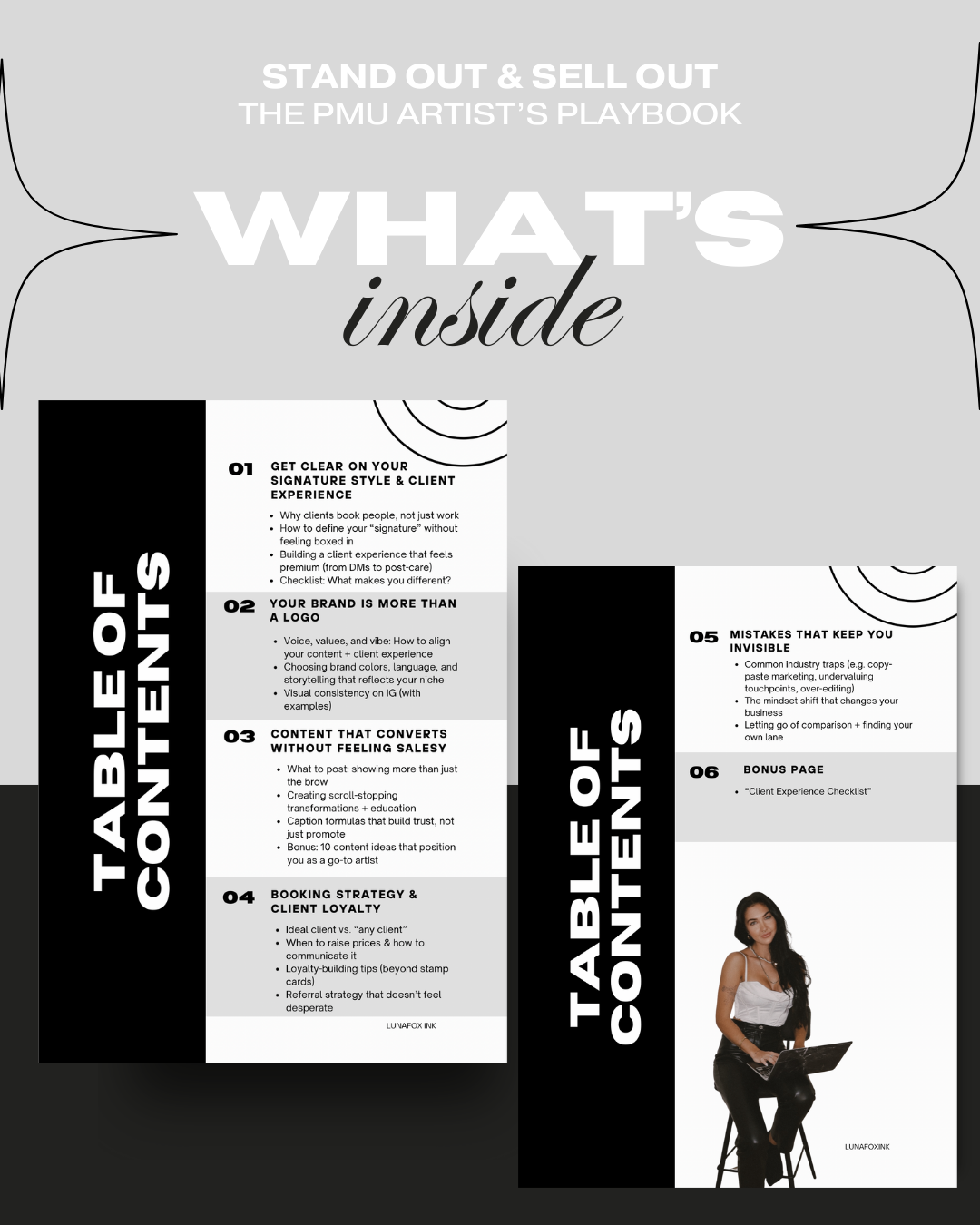 That’s why I created The Stand Out & Sell Out Playbook — a step-by-step guide for PMU artists who want to:
